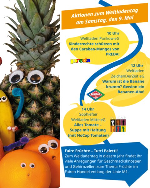 An drei Stationen richten wir zusammen mit den Weltläden Zeichen der Zeit und SophieFair den Blick auf globale Frucht-Lieferketten, ungleiche Machtverhältnisse im Handel und auf die Frage, wie Wertschöpfung gerechter verteilt werden kann.