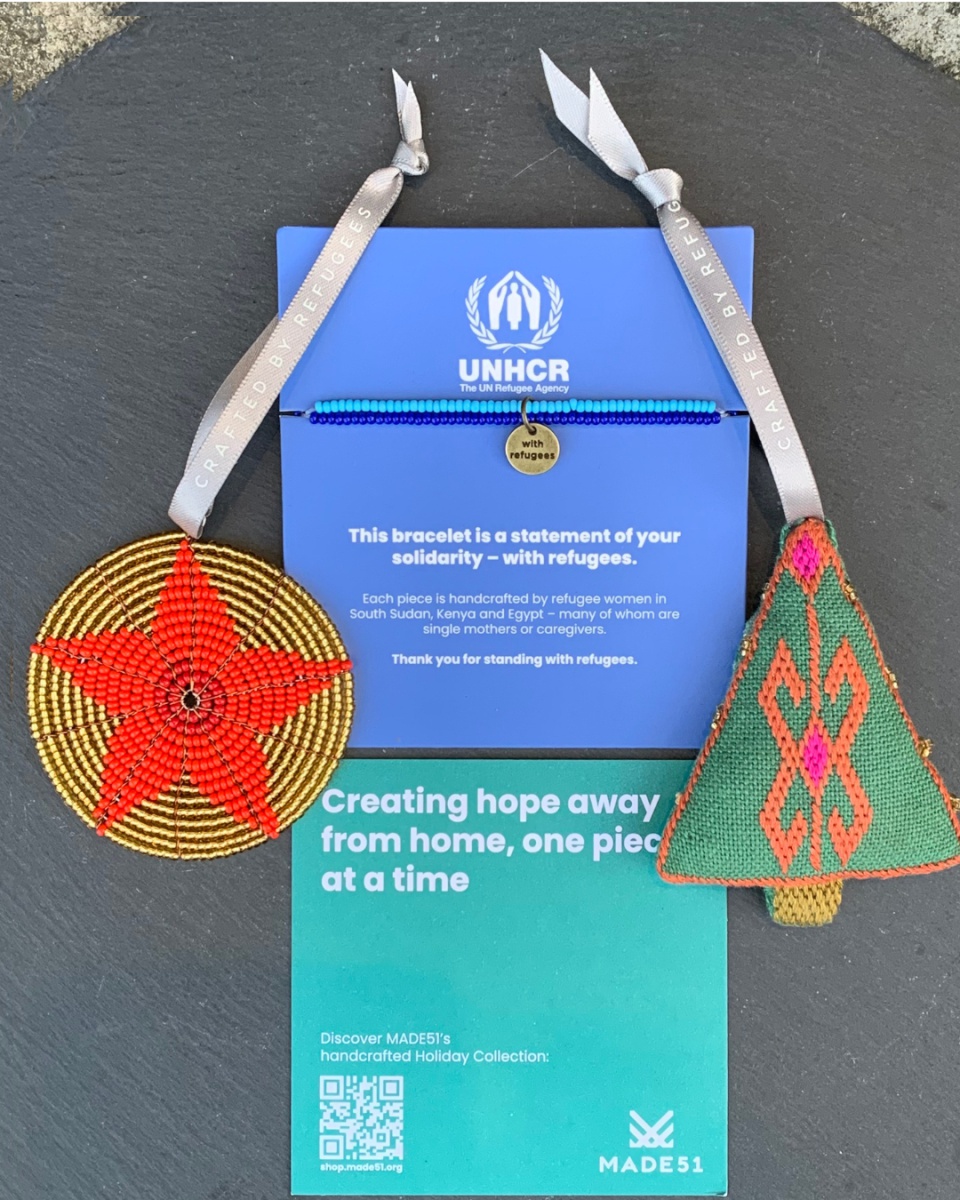 erInnen mit lokalen Sozialunternehmen. Das Projekt bringt so handgefertigte Produkte aus Krisenregionen auf den Weltmarkt und schafft so Einkommen, Selbstbestimmung und Sichtbarkeit für Geflüchtete. Die Armbänder und Baumanhänger der MADE51-Kollektion sind neu bei uns ins Sortiment eingezogen.